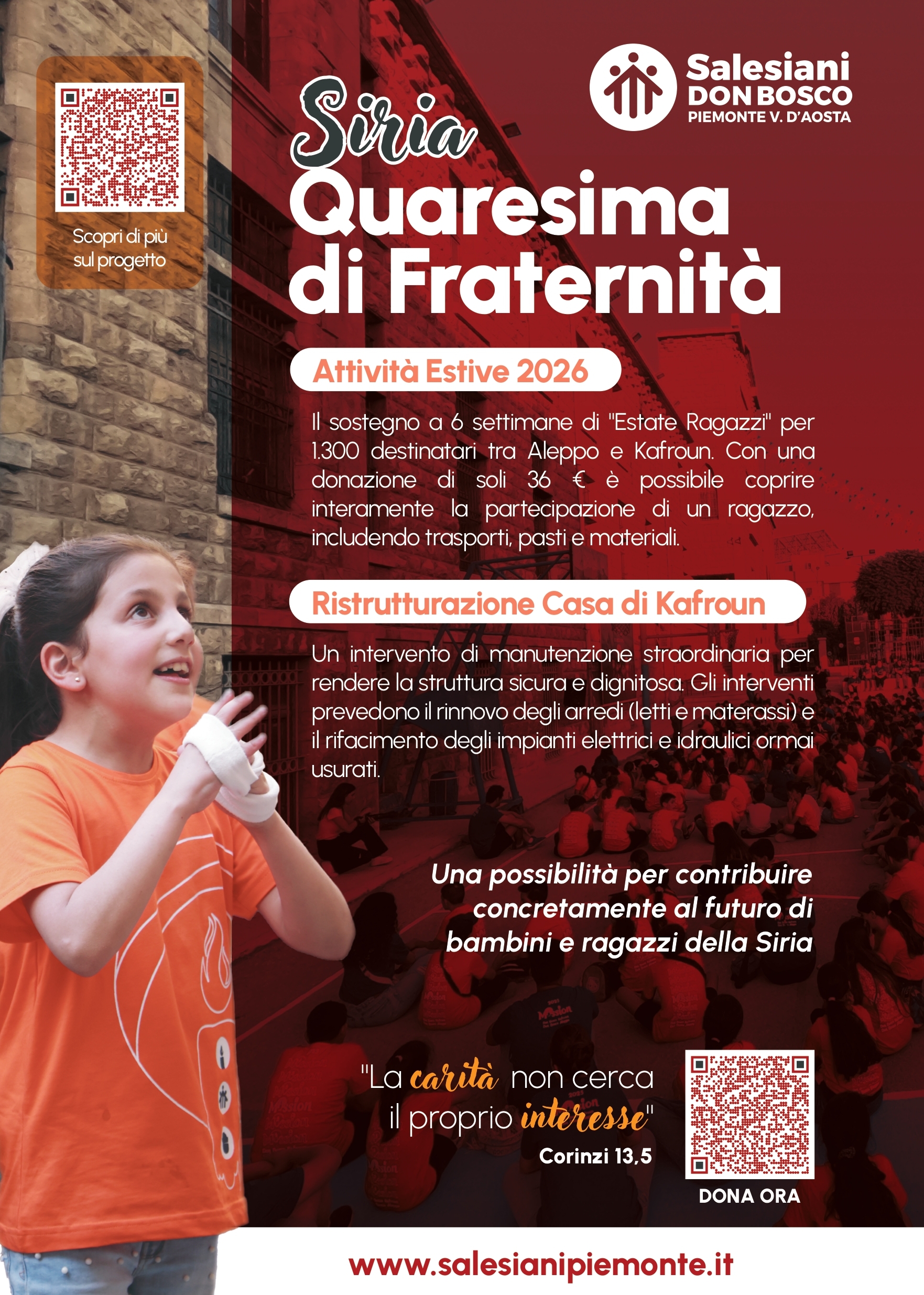 La Quaresima è sempre un tempo che ci richiama all’essenziale: alla cura, alla solidarietà, alla scelta concreta di stare accanto a chi vive ferite profonde. Per il 2026, la nostra Ispettoria rinnova questo impegno con uno sguardo particolare rivolto ai giovani di Aleppo e Kafroun, in Siria, terre segnate da oltre quattordici anni di crisi, instabilità e –  più recentemente – dal devastante terremoto.