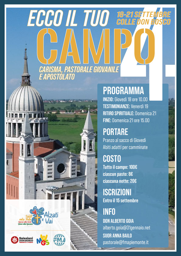 Dal 18 al 21 settembre 2025 al Colle don Bosco torna il Campo 4: un momento di ritiro e riflessione per i giovani neo-maturati fino ai 29 anni.