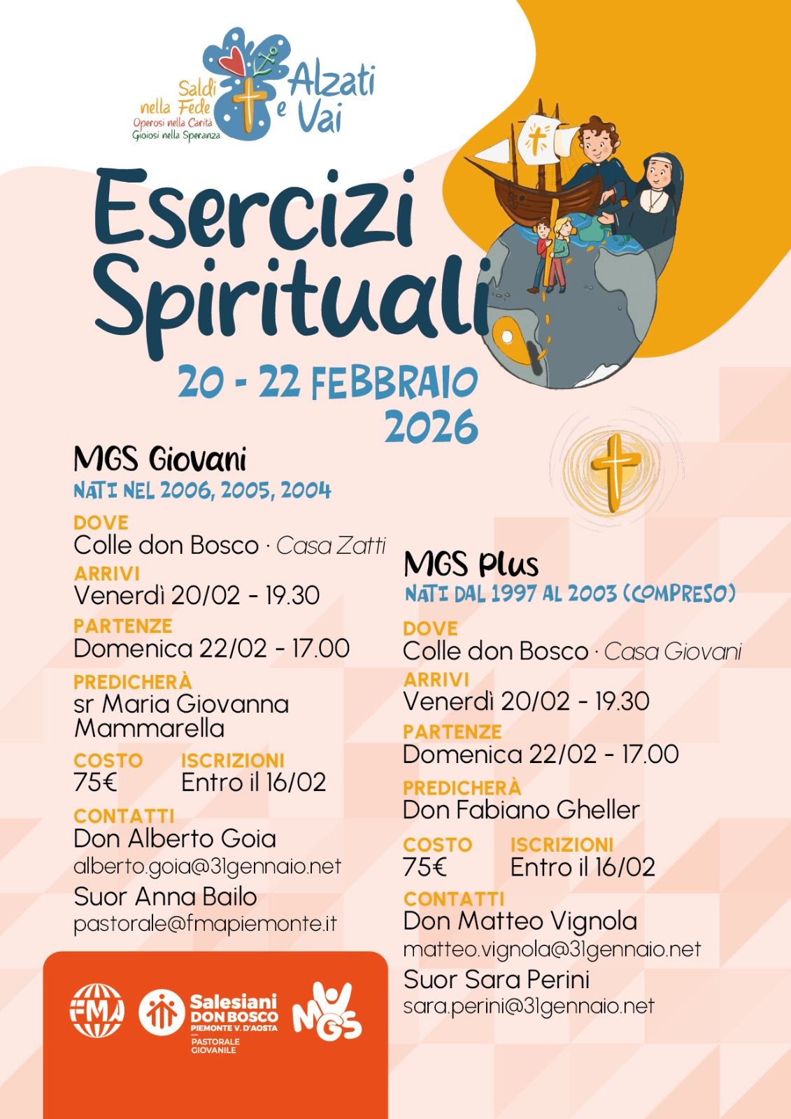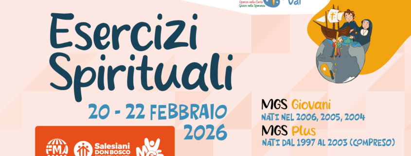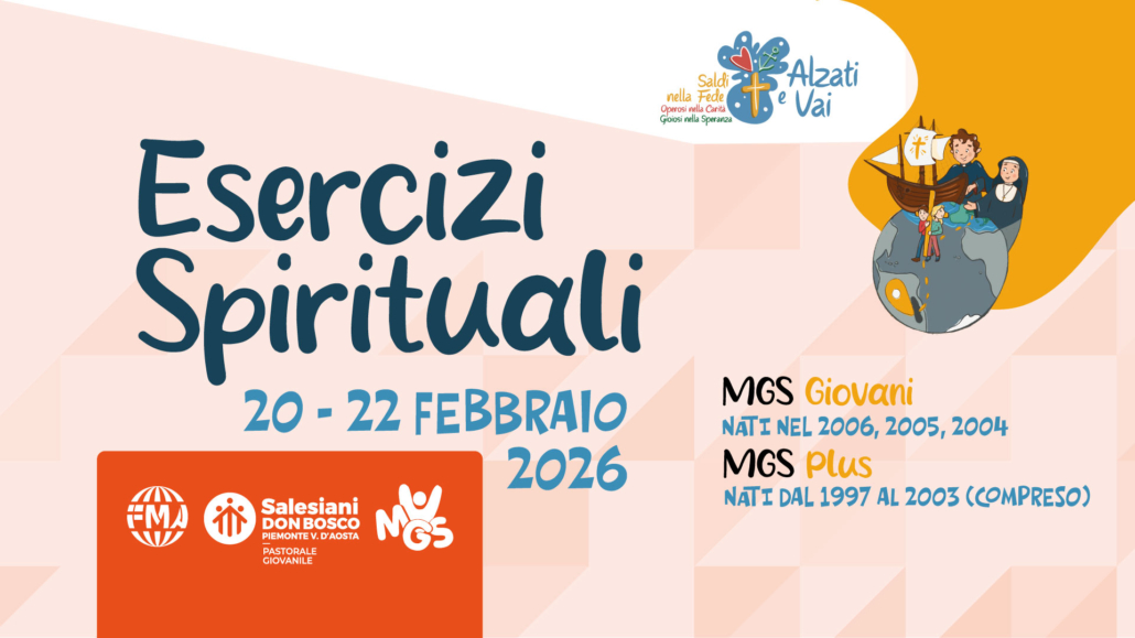 Il weekend del 20 – 22 febbraio 2026 tornano gli Esercizi Spirituali dedicati ai giovani universitari e lavoratori. Un doppio appuntamento al Colle Don Bosco: i giovani nati dal 2004 al 2006 (MGS Giovani) nella Casa Zatti, e i nati dal 1997 al 2003 (MGS Plus) nella Casa Giovani.